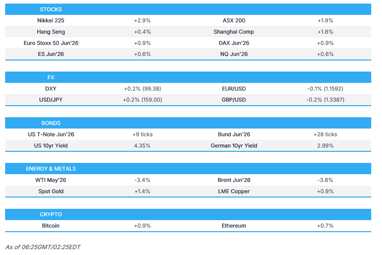 - 10yr UST futures gained as hopes for a ceasefire in the Iran conflict pressured oil and dragged yields lower, while there was little reaction to the latest Fed comments from Barr and Goolsbee, pointing to uncertainty and risks from the Iran conflict.