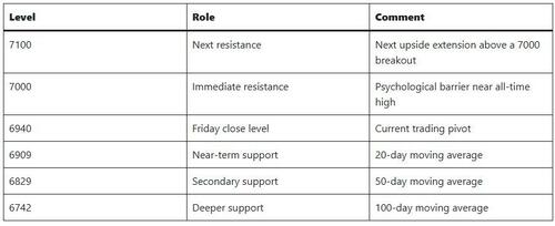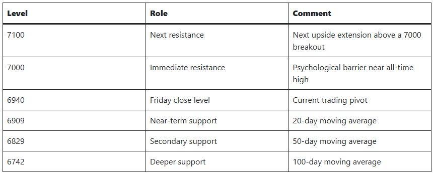 The next directional move will likely hinge on the market’s ability to clear resistance above 7000 or to test deeper support levels that define the current trend structure.