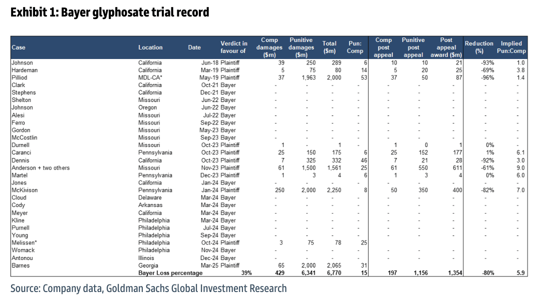 Late on Friday night (post EU market close), a jury ruled against Bayer in the Barnes Roundup case, leading to an award of $2.065bn (being $2bn punitive damages and $65m compensatory damages - see here). While each case is different, and this is the first case in Georgia (see Exhibit 1), typically awards are reduced on appeal. Bayer intends to appeal the judgment. As a reminder, at the end of 2024, the provision related to glyphosate related litigation was $5.9bn.