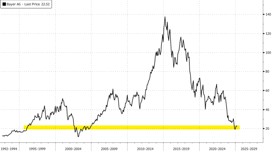 Bayer's shares are down about 5% in European trading. Zooming out, shares are trading at 2004 lows....