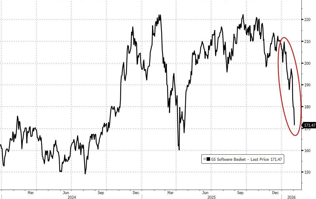 For now, traders are selling first as the threat of falling software equity prices prompts painful balance sheet reflection at private credit shops (which don't report until late Fed/early March), triggering less availability of credit (or pulling existing lines), feeding back into lower growth potential for software companies (which already face existential threats from AI).