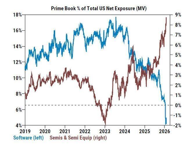 Hedge funds have already been exiting the 'software' building en masse, as noted over the weekend, Goldman's Prime Brokerage showed a stunning chart: the divergence between hedge fund exposure in semiconductor companies (broadly seen as beneficiaries of the AI supercycle) and software companies (increasingly seen as the biggest losers of AI), has never been greater.