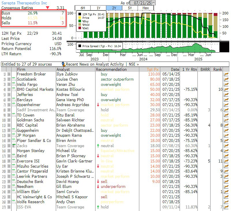 Sarepta shares have already plunged more than 90% over the past year, now trading at $14.08, down from a 52-week high of $150.48. According to Bloomberg, the stock now holds 7 Buy, 16 Hold, and 3 Sell ratings.