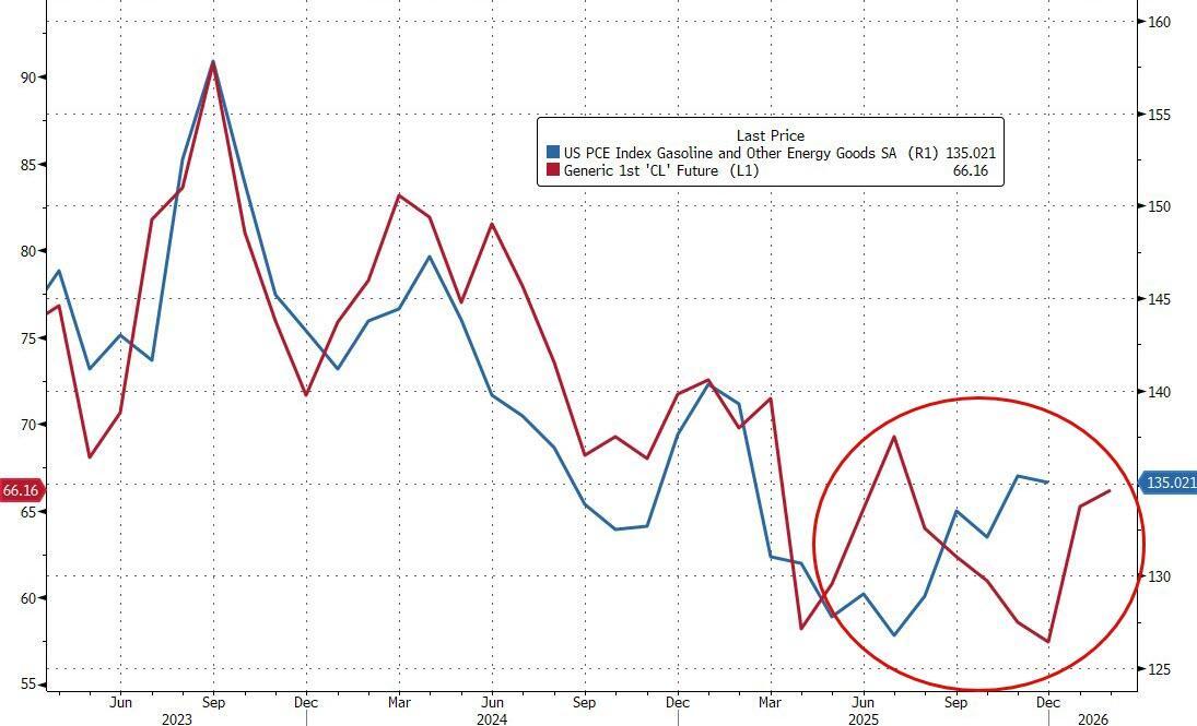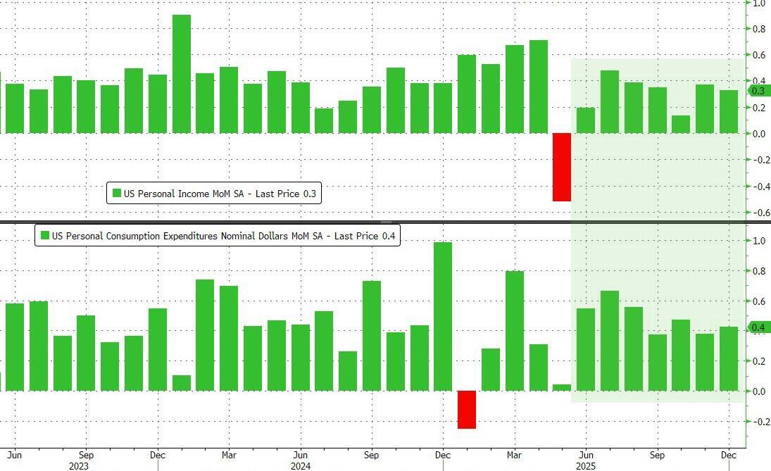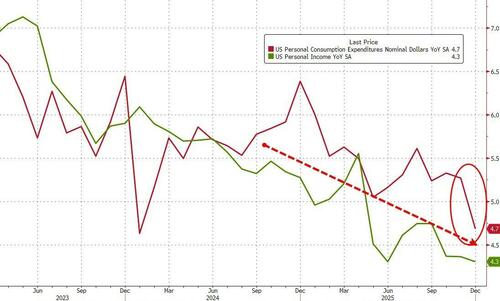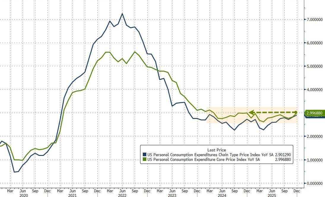 The Fed's favorite inflation indicator - Core PCE (a measure of price changes in consumer goods and services that excludes volatile food and energy costs) - rose 0.4% in December (the latest data released today), slightly hotter than expected (+0.3% MoM). That lifted YoY inflation up 3.0% (above the prior month and hotter than expected) - the highest since April 2025...