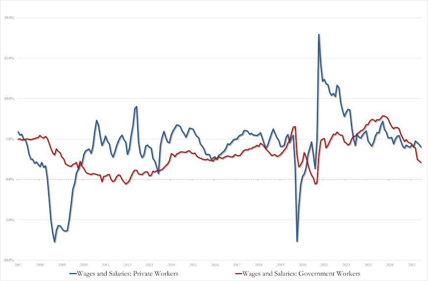 Wage growth is slowing, especially for government workers...