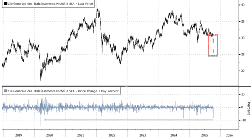 Shares of French tiremaker Michelin plunged in Paris, marking the steepest intraday decline since the early Covid-pandemic crash, after the company slashed its 2025 outlook and warned of a bigger-than-expected sales decline in the North America market.