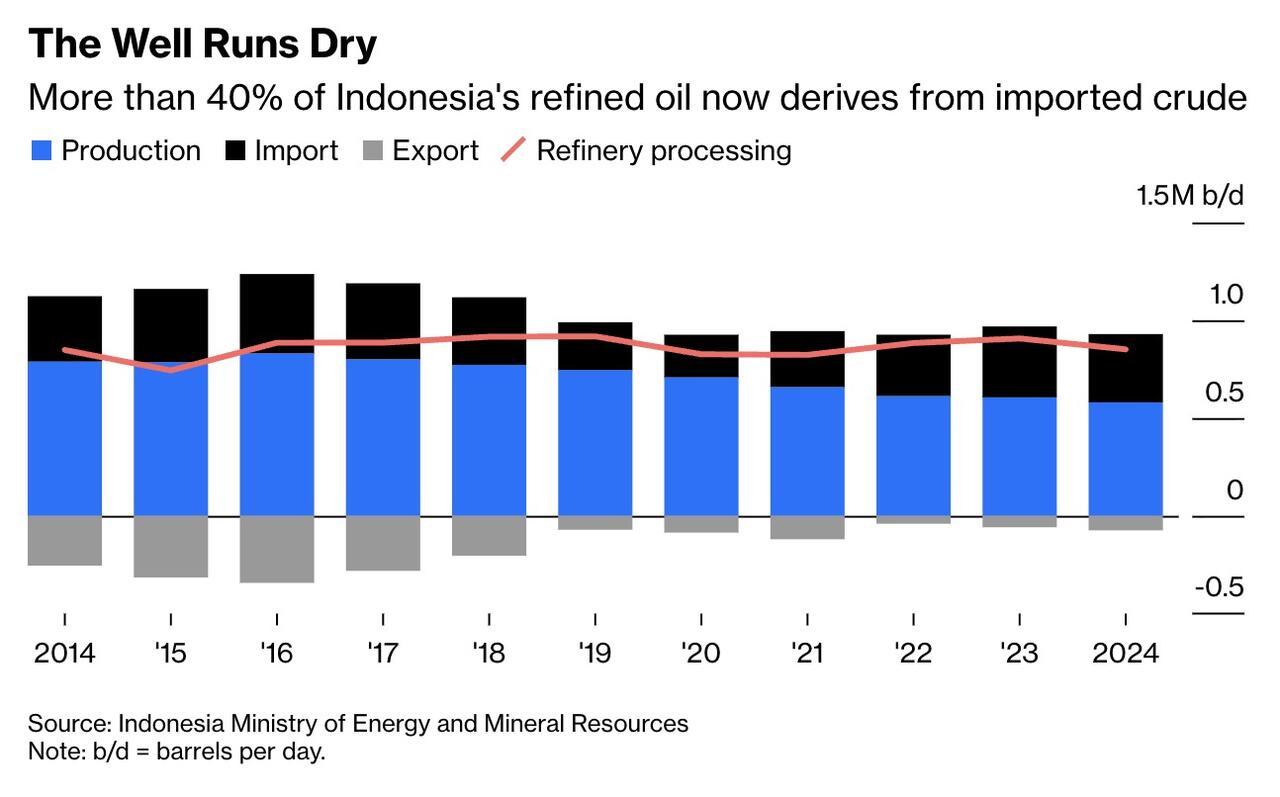 Bloomberg writes that since those glory days, output has fallen by two-thirds while the population has doubled to 283 million. Indonesia now imports much of its refined fuel, consumes more gasoline than Germany, and boasts one of the world’s largest vehicle fleets — mostly scooters. As ever, the profits have flowed toward insiders. Suharto-era cronies dominated oil trading in the 1980s, and protests over fuel prices helped bring down his regime in 1998.