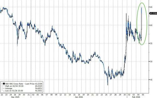 Silver's relative underperformance has smashed the Gold/Silver ratio back above 65x (6 week highs)...