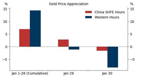 Most of the buildup and unwind in gold prices occurred while SHFE--the venue for Chinese speculative futures trading--was closed.