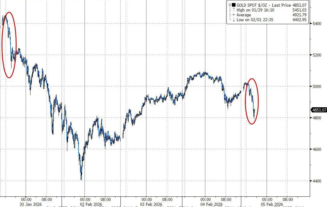 Spot Gold prices are also down (around 4-5%), with $5000 seemingly acting as serious resistance...