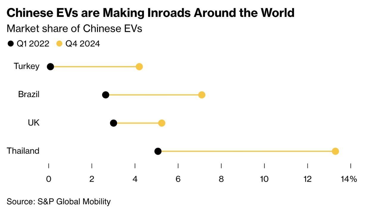 Chinese EVs like Great Wall, BYD, Chery, and SAIC are flooding the streets in places other than the U.S., according to a new report from Bloomberg.