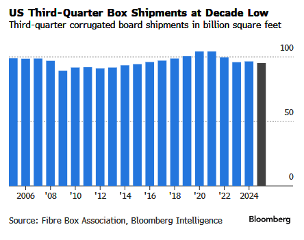 Smurfit Westrock posted an 8.7% YoY decline in Q3 North American box volumes, sending shares to their lowest since mid-2024.