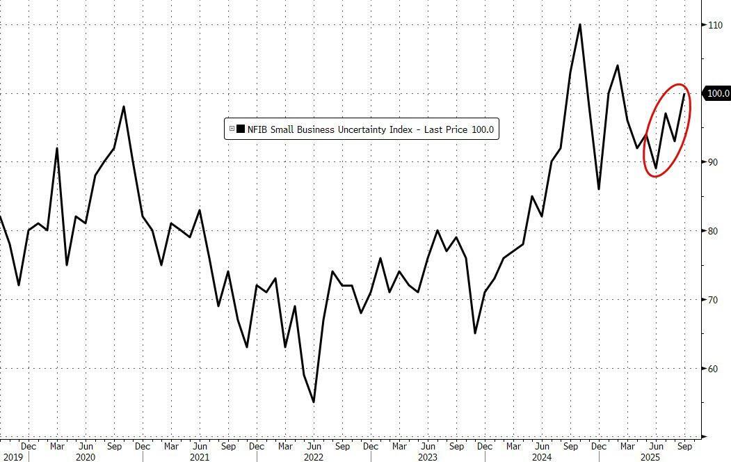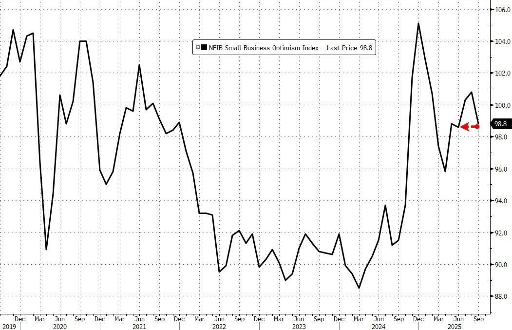 Amid a dearth of macro data due to the shutdowns, this month's Small Business Optimism survey suddenly becomes noteworthy with the headline sentiment index dipping in September to a three-month low (down 2 pts to 98.8)on less optimism about the economic outlook and greater concern about excess inventory.