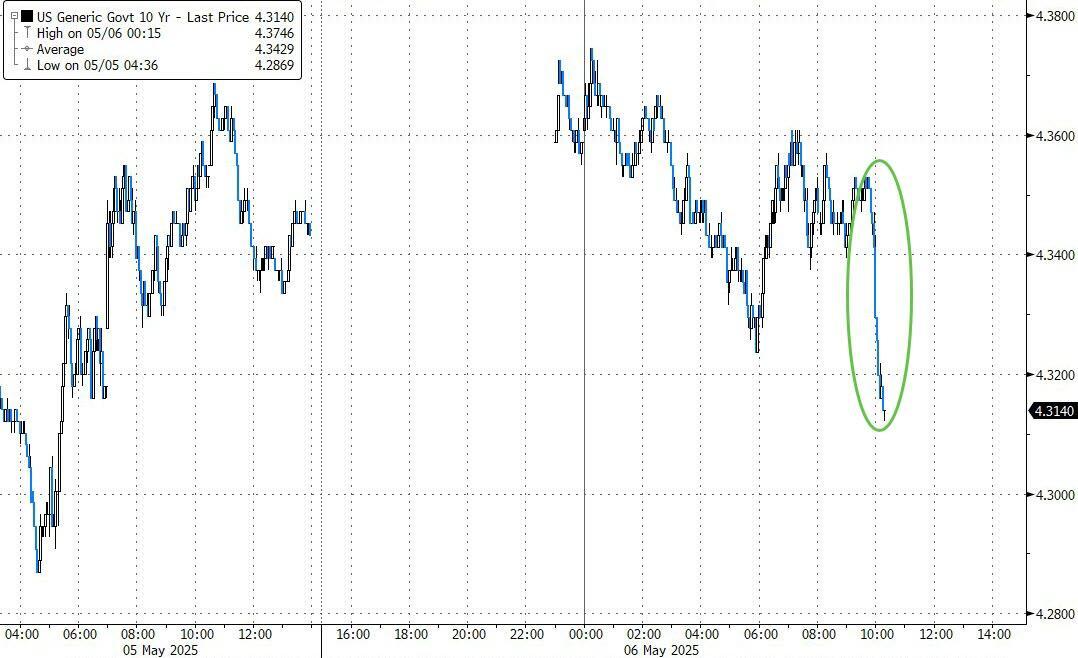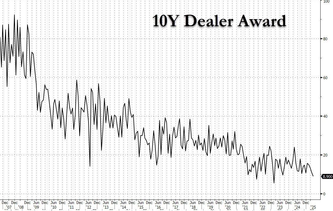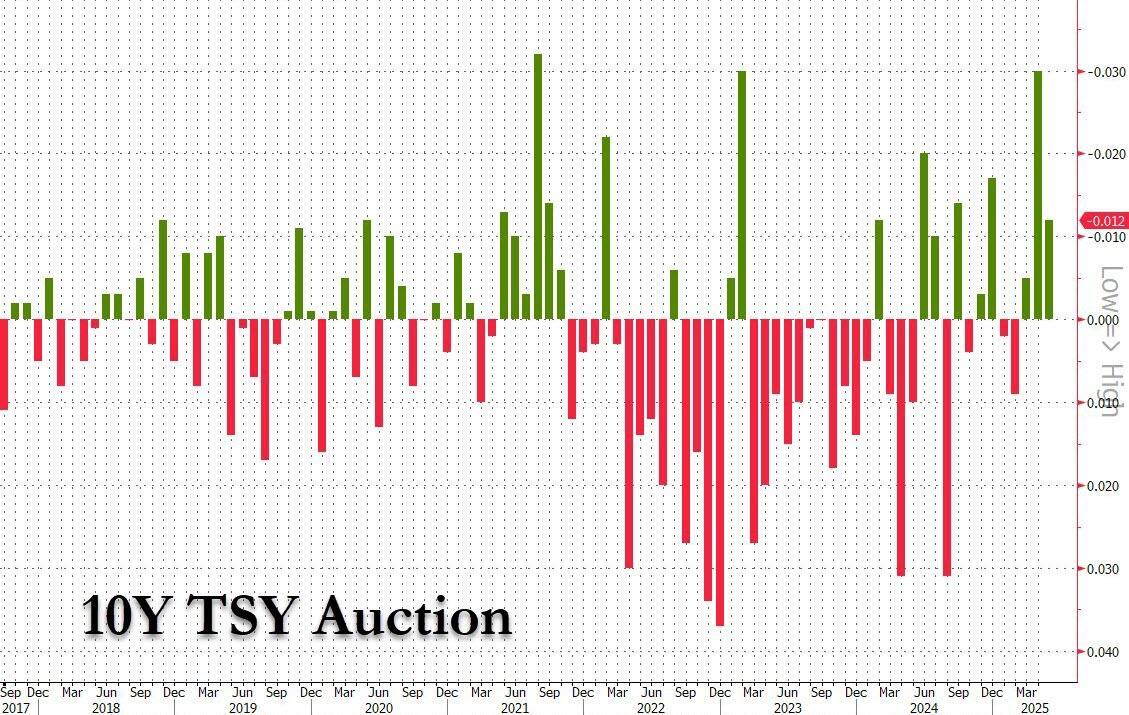 At 1pm, the Treasury announced that it had sold $42 billion in 10Y paper at a high yield of 4.342%, down from 4.4350% last month, and the second lowest of 2025. So much for yields exploding higher and nobody wanting to hold US paper any more. More importantly, with the When Issued trading at 4.354% ahead of the break, the auction stopped through by 1.2bps, the 3rd straight stop through and 5th of the last 7.