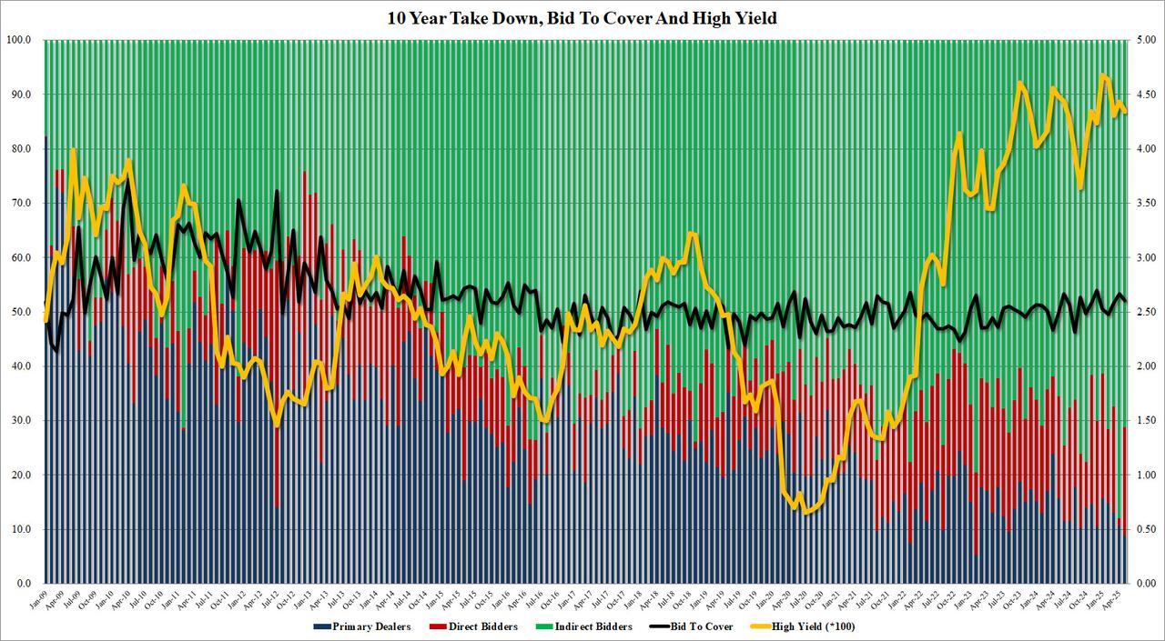 The internals were also stellar, with Indirects, or foreign buyers, awarded 71.2% of the auction, down from a record 87.9 in April, but one of the highest on record.