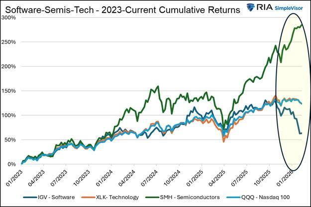 In this article, we address one such divergence between the broad technology sector and the software-as-a-service (SaaS) sub-industry. The graph below shows the wide gap in returns between software, technology, the Nasdaq 100, and semiconductor stocks. Since the well-followed software ETF (IGV) peaked on September 19, 2025, it has fallen 30%. For context, the broad technology indexes (XLK and QQQ) are flat over the period, and the semiconductor ETF (SMH) is up 30%.