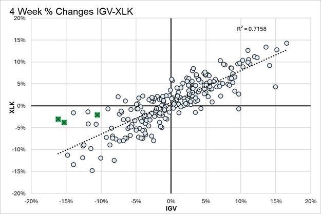 The second graphic uses the last five years to also show how detached the sturdy relationship has drifted recently. Per the most recent weekly readings (green), either XLK is 10% overpriced, or IGV is 10% underpriced.