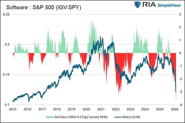We caution that market rotations have been volatile, with many relationships, like those shown earlier, statistically very stretched. While that may provide comfort for some, we are also aware that in markets like this, where narratives are as strong as they are, relationships can become even more divergent. If you are inclined to buy into the software sector, we recommend taking small starter positions with a stop-loss level in mind. This way, if you are early, the losses are minimal. If the rotations start favoring software stocks and the narrative fades, such evidence may warrant increasing the starter positions. Trade with caution.