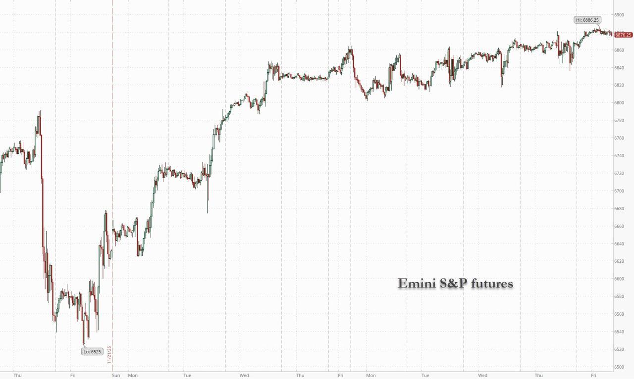 Stock futures rise as investors look ahead to Friday’s release of the Fed’s preferred inflation gauge, the core PCE, a reading that may help shape next week’s rate outlook as the BoJ charts its own divergent policy course. As of *;15am ET, S&P 500 futures were 0.2% higher and on pace for the 9th gain in 10 days; Nasdaq 100 futures are +0.3% as Mag 7 names are mostly higher premarket, led by META (+0.6%), AMZN (+0.5%) and NVDA (+0.5%). Tech sentiment got a boost after Nvidia partner Hon Hai Precision Industry reported strong sales. Moore Threads, a leading Chinese AI chipmaker, jumped 425% in its Shanghai trading debut. Netflix meanwhile, fell in the premarket after agreeing a tie-up with Warner Bros, acquiring HBO. Bond yields are modestly higher; the USD is flat. Commodities are mixed: oil and base metals are lower, while precious metals are higher. US economic calendar includes September personal income/spending and PCE inflation gauges and December preliminary University of Michigan sentiment (10am New York time) and October consumer credit (3pm