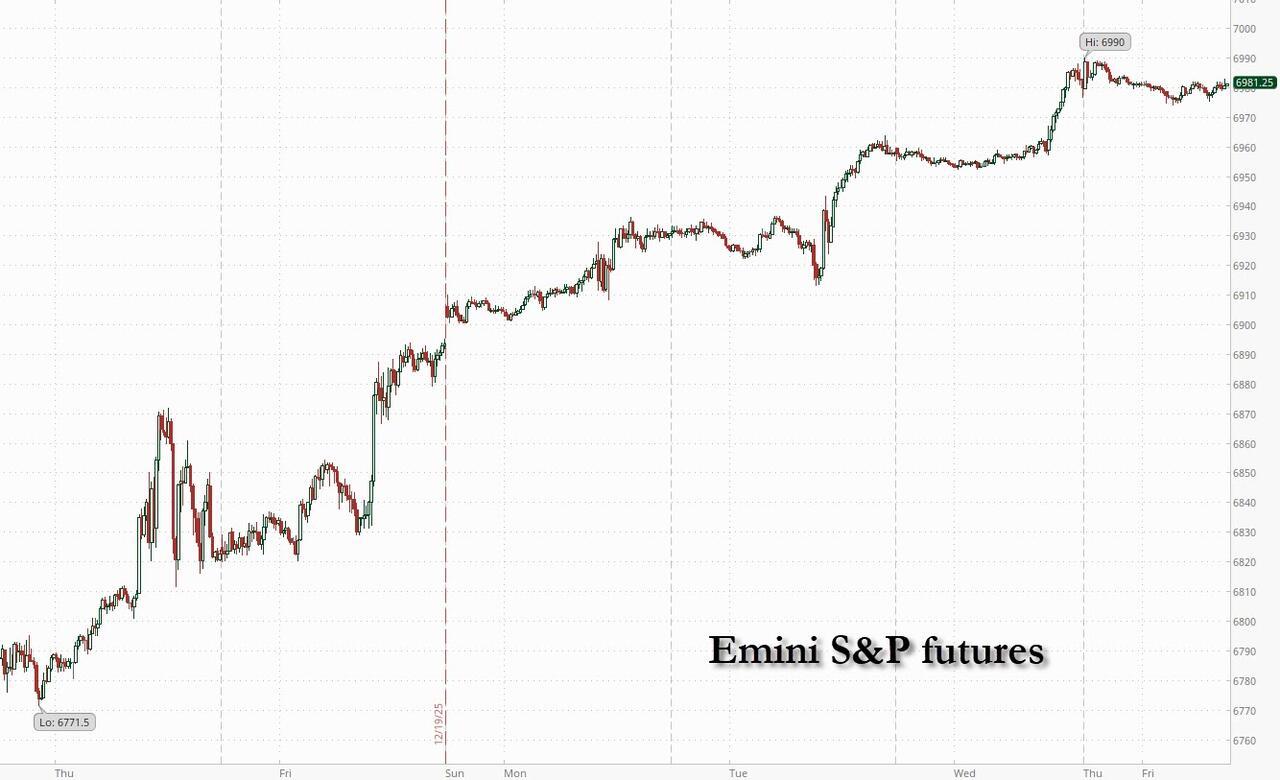 US equity futures are little changed in thin trading with most traders away from the screens, while the bulk of overnight actions was once again in gold and silver as precious metals soared to a new record high driven by feverish Chinese demand. As of 8:15am, S&P futures were flat after closing Wednesday's session at a new record high, while Nasdaq 100 futs were fractionally in the green. Asian markets were mostly higher while European bourses are closed. The dollar was unchanged as were treasuries, with the benchmark 10-year yield at 4.13%. There is no macro on today's calendar.