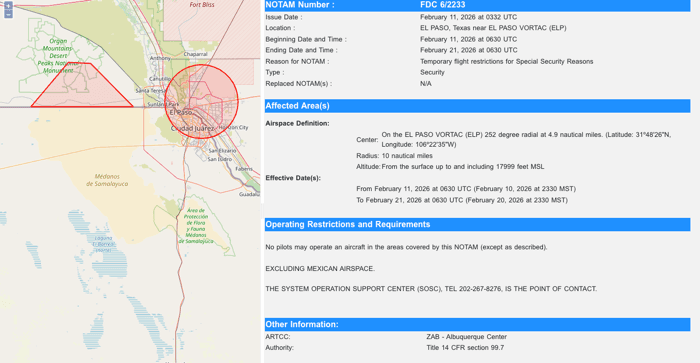 The El Paso city government issued an advisory earlier that read, "The FAA, on short notice, issued a temporary flight restriction halting all flights to and from El Paso and our neighboring community, Santa Teresa, NM. The restriction prohibits all aircraft operations (including commercial, cargo and general aviation) and is effective from February 10 at 11:30 PM (MST) to February 20 at 11:30 PM (MST)."