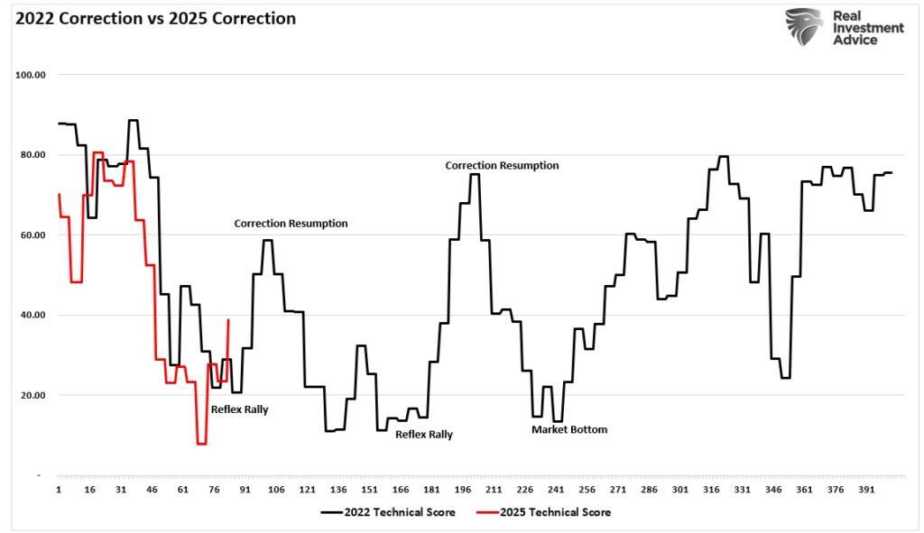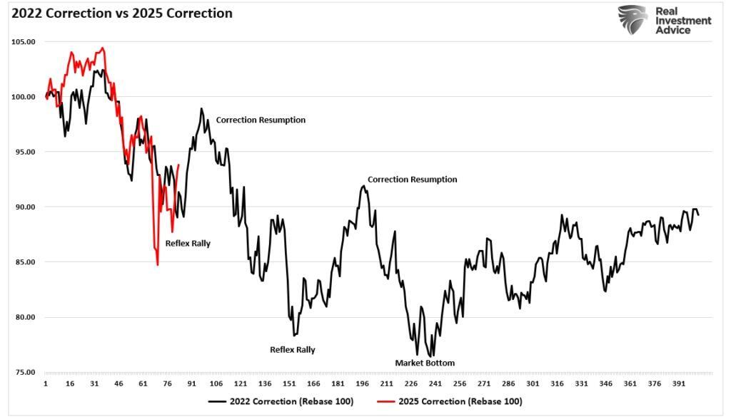 In “Is Risk Off Positioning Signaling A Market Low,” we discussed the extremely oversold market conditions that are beginning to suggest the market may be approaching a near-term low. That analysis was based on various indicators, including extremely negative investor sentiment, positioning, and technical oversold conditions. As we stated, the current market environment is much like 2022. The first chart below shows the 2022 market correction versus 2025. The rally that began this past week could certainly rally further. Still, as we have warned, any rally in the near term will likely be met with sellers until there is a resolution on tariffs, monetary policy, and more certainty around recession risks.