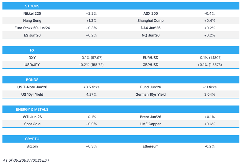 - US stocks mostly remained supported in risk-on trade, which saw the S&P 500 and Nasdaq print fresh record highs, as markets completely unwound the downside seen since the start of the Iran war. Optimism remained regarding an end to the conflict after US President Trump had reiterated that he sees the war being very close to over, while there were reports regarding a two-week ceasefire extension, although both sides denied they had reached out to offer such an olive branch.