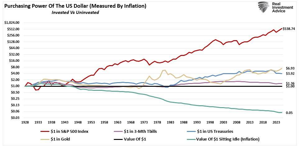 What those promoting the “debasement” argument misunderstand is how economics and modern inflation work. What the chart shows, in today’s economy, is only the loss of purchasing power of idle, or uninvested, dollars. Dollars that sit uninvested lose value relative to inflation over time. That is not a collapse of fiat currency. It is a signal to put capital to work. While the “gold bugs” argue that gold protects against debasement (i.e., inflation), which is true, so do 3-month T-bills and US Treasury bonds on a real, inflation-adjusted, total return basis. However, that same $1 invested in the S&P 500 index was by far the best protector of the purchasing power of the U.S. Dollar