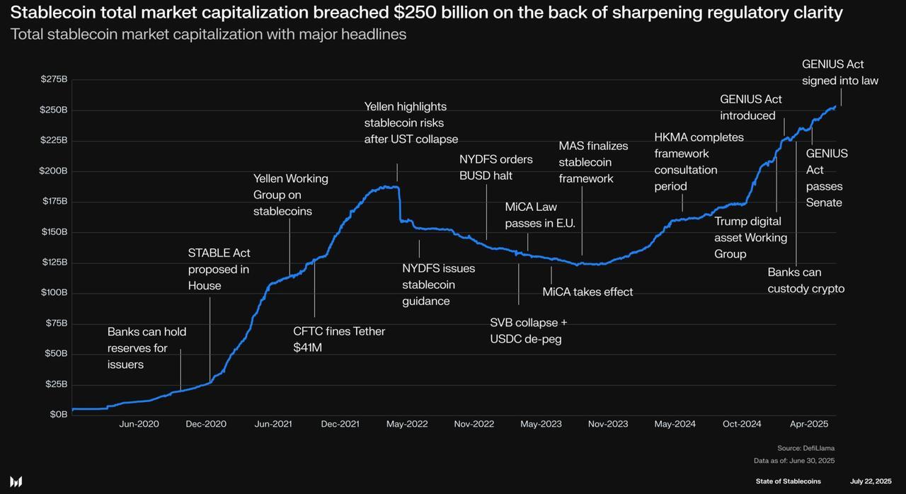 “Stablecoins have moved into mainstream finance, linking bank systems with digital asset networks. Dollar-pegged tokens already move volumes on par with major payment networks, with transactions rivaling those of ACH, Visa, and PayPal. In mid-2025, the supply of stablecoins crossed $250B, reflecting demand for quicker, always-on payments.”