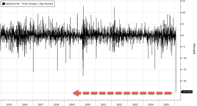 Stellantis shares in Milan fell as much as 24%, the most on record in Bloomberg data dating back to 2015.