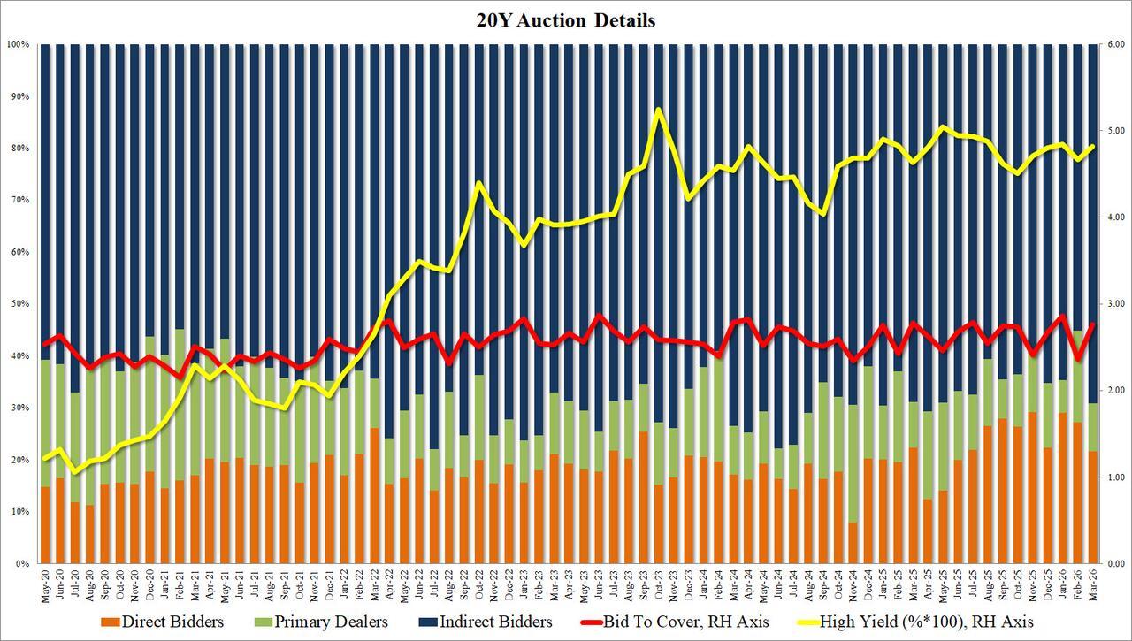 Internals were especially strong, with Foreign demand surging from just 55.2% in February, to 69.2% in March, the highest Indirect award since April 2025 (and obviously above the recent average of 62.1%). And with Directs taking down 21.6%, below the six-auction average of 27.0%, Dealers were left holding 9.2%, a big drop from 17.6% in February and one of the lowest Dealer allotments on record.