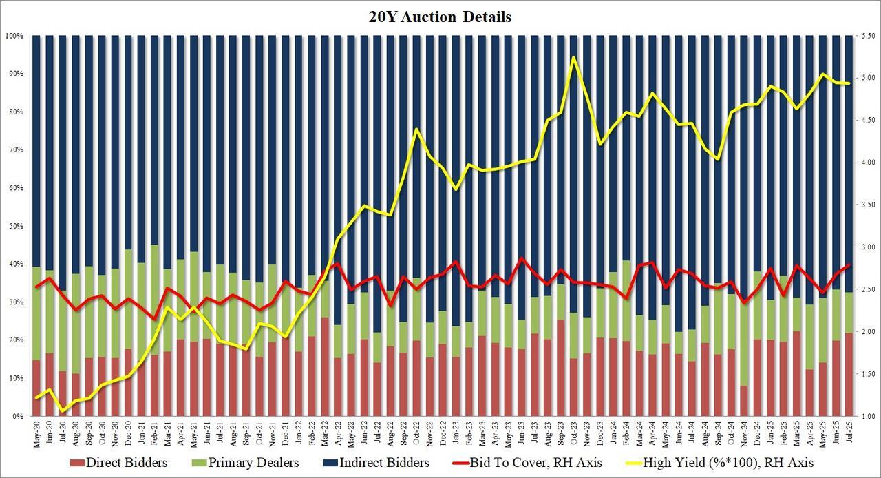 The bid to cover was als impressive, shooting up to 2.79 from 2.68 in June, and the highest since April 2024 (clearly, it was well above the six-auction average of 2.62).
