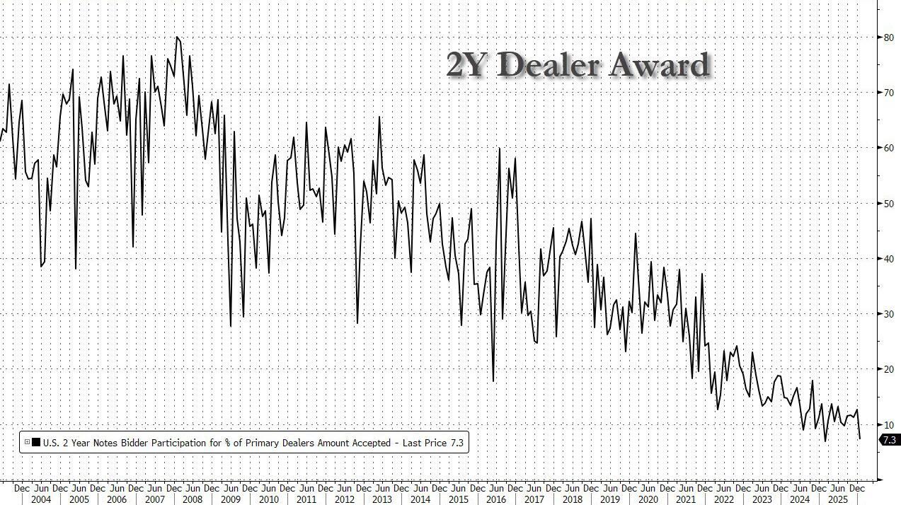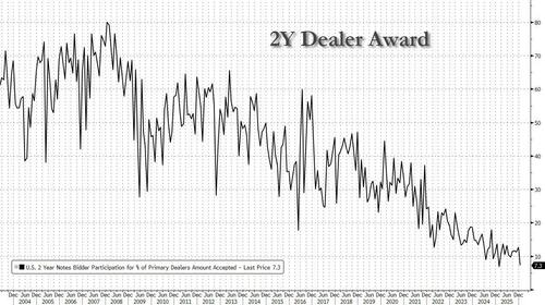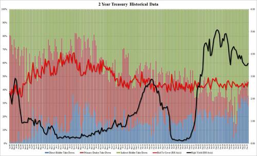 Stellar 2Y Trasury Auction: Surge In Indirects & Bid-To-Cover; Second Lowest Dealers On Record