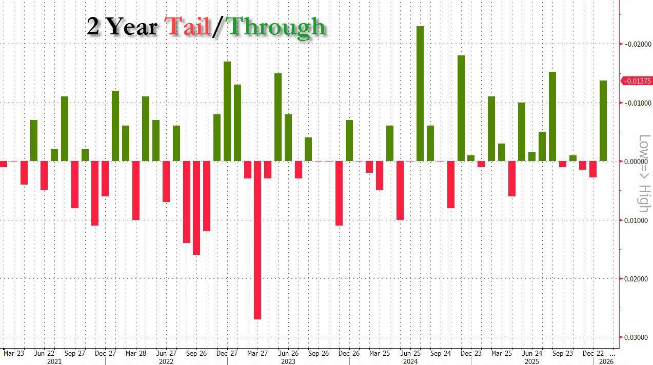 The bid to cover jumped to 2.750, up from 2.543 and the highest since Nov 2024 (the six-auction average was 2.61).