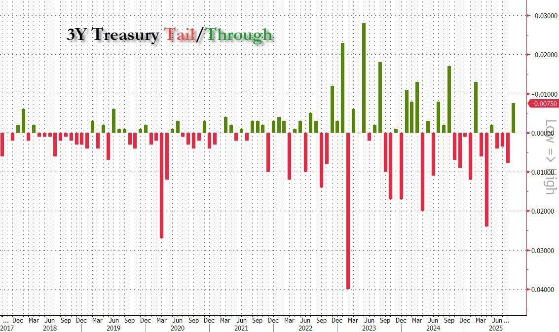 First, the auction stopped at high yield of 3.485%, down sharply from 3.669% last month, and the lowest since Sept 2024 when the Fed was about to cut rates by a jumbo 50bps on another huge downward jobs revision print. The auction stopped through the When Issued 3.492% by 0.7bps, and following 3 straight tailing auctions, was the biggest through since Feb 2025.