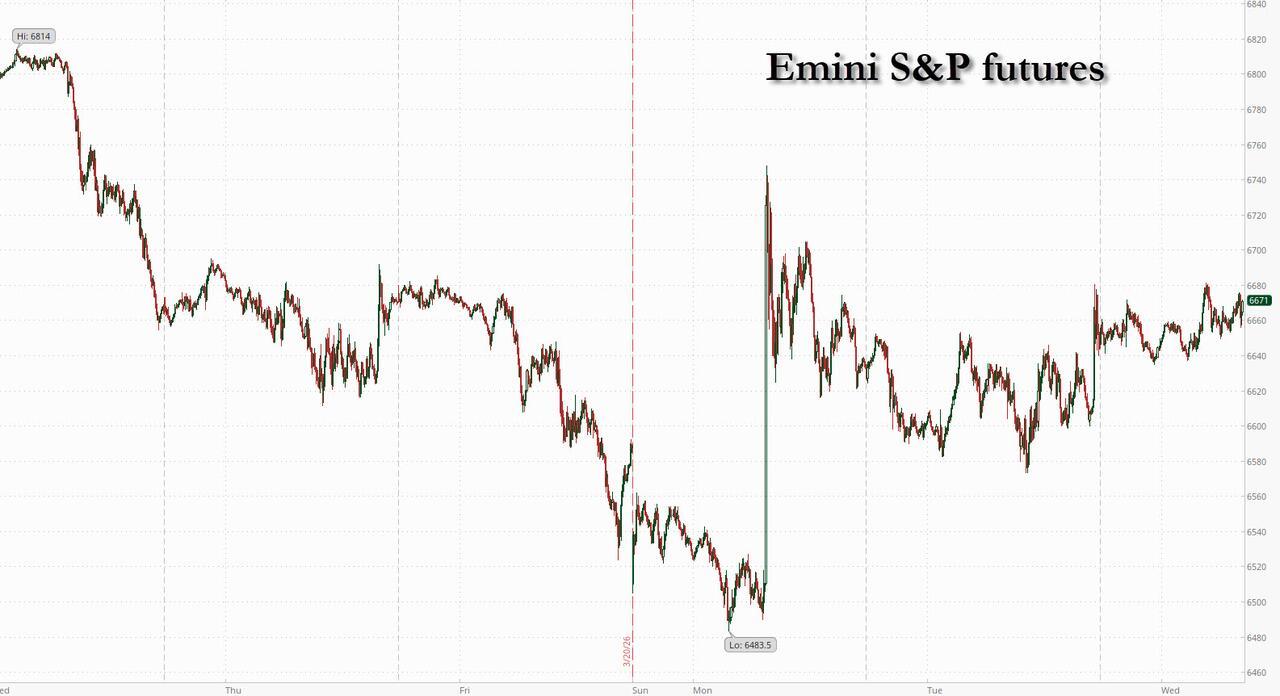 US futures are sharply higher and oil tumbles as the US reportedly offered a15-point plan to help bring the conflict to a close triggering a global rally; Meanwhile Iran is said to have rejected the plan and kept up missile and drone attacks on Israel and Arab Gulf states in response to attacks on its own facilities, while the US continues to move new military assets into place ahead of Trump’s deadline to reopen the SoH. So the situation remains fluid. Even so, S&P futures rose 1.0% and Nasdaq futures gained over 1.1% , with all Mag 7 stocks higher pre-market; Semis and Cyclicals ex-Energy are higher with some defensives such as healthcare maintaining a bid. The yield on two-year Treasuries dropped four basis points to 3.86% while 10Y yields traded down to 4.31%; the USD is flat and commodities are selling off. Energy and natgas are weaker; Brent fell 6% to below $99 a barrel even as the Strait of Hormuz remained effectively shut as a diplomatic push by the US to try to end the war with Iran gathered pace, eclipsing news of more troops being sent to the region; precious metals are rallying despite the USD being flat. Meanwhile, reminding us that another war is taking place, drones attacked Russia’s Ust-Luga port on the Baltic Sea, setting it on fire as Ukraine carried out the most intense air strike on its foe in more than a year. Today's US economic data calendar includes February import/export priced index and 4Q current account balance (8:30am). Fed speaker slate includes Miran at 4:10pm