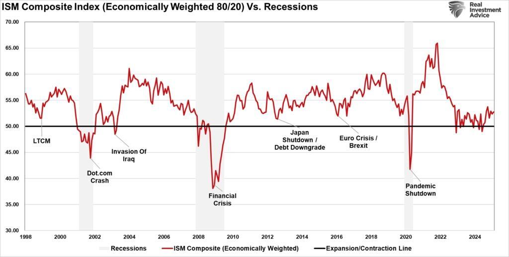 Furthermore, if we weigh the ISM Manufacturing and Services Indices to the compensation of the economy, there is no current recessionary warning.