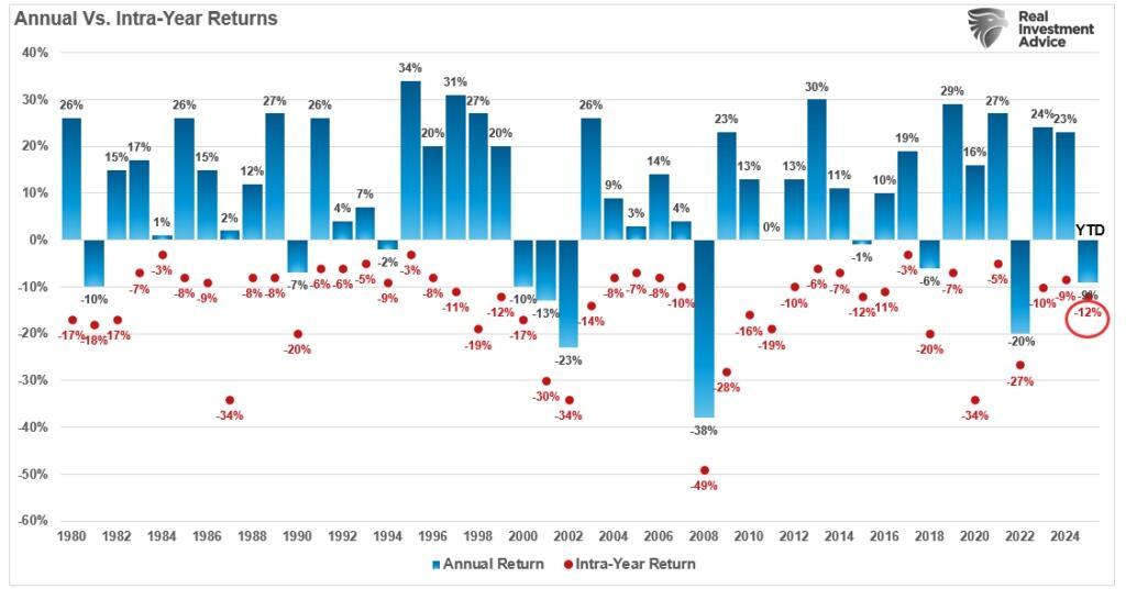 Corrections in the stock market can occur due to many short-term factors, such as geopolitical tensions, overvaluation, or shifts in investor sentiment. We are in no short supply of those factors. Today, investors focus on the impact of tariffs, sticky inflation, and elevated valuations. As expected, the stock market correction has already led to a reversal in both sentiment and valuations since valuations are a function of sentiment.