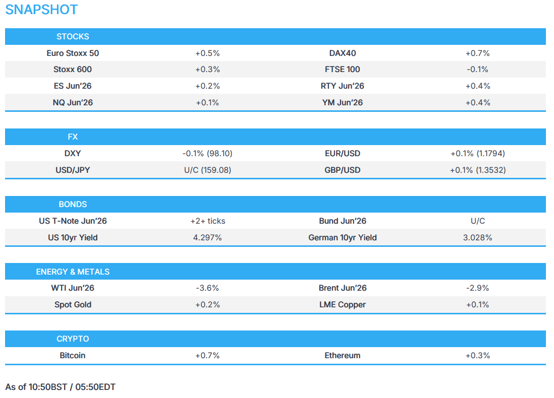 - Crude price action has been choppy this morning, prices fell on hopes of reduced Middle East supply disruption, with Brent Jun'26 moving towards USD 98/bbl (USD 96.15-98.98/bbl range) and WTI Jun'26 sub-90/bbl (in a USD 87.46-90.34/bbl range), before recovering slightly on the Lebanon ambulance report. New lows were hit shortly after wires re-ran overnight reports of a Pakistani-flagged tanker exiting the Persian Gulf, whilst other reports suggested Indian refiners are paying for Iranian crude in CNY. Do note the low for today is a moving target, at the time of writing.