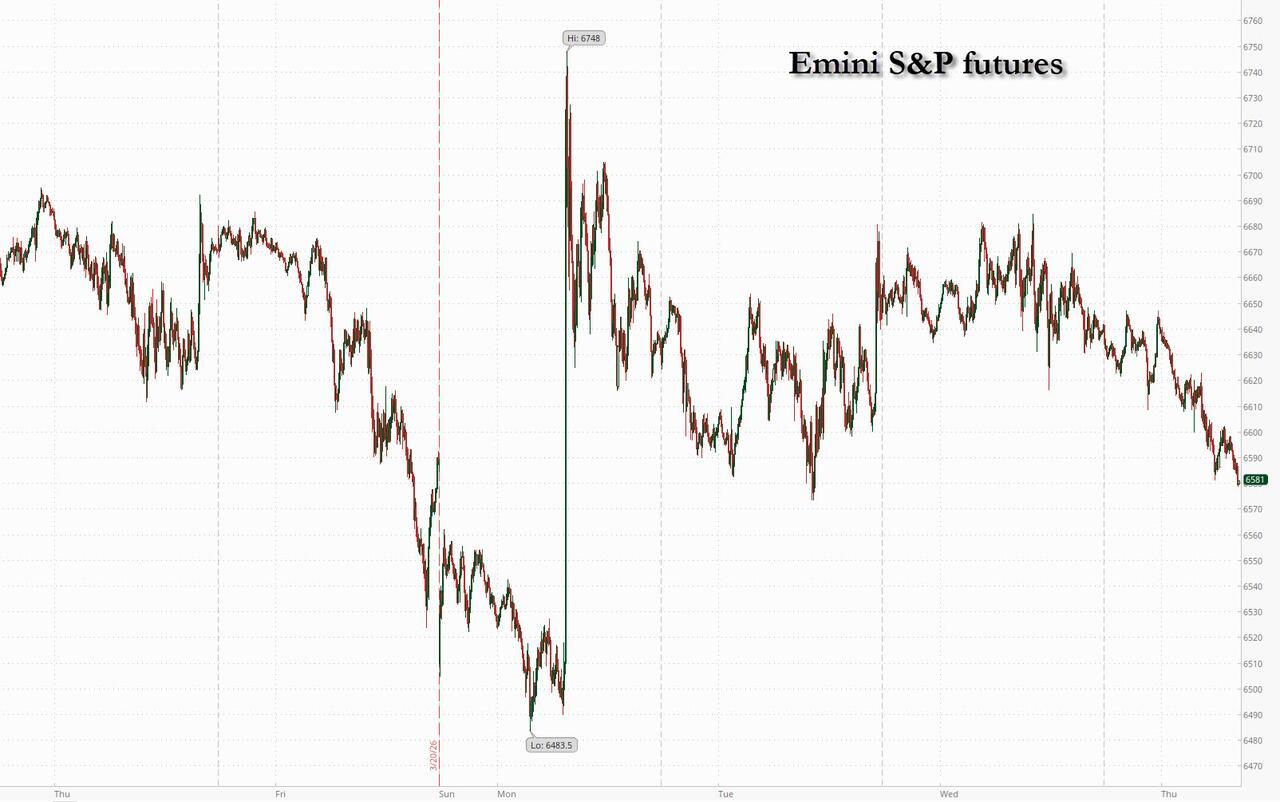 It's Day 27 of the war: stocks and bonds fell globally as ceasefire optimism fades given mixed messages on progress toward ending the war in Iran and growing uncertainty over Iran’s willingness to engage in talks about a ceasefire in the Middle East sent oil prices higher. Futures gapped lower just after 5am ET, when Axios reported that the Pentagon is developing military options for a “final blow” in Iran that could include ground troops. Trump urged Iran “to get serious” before it was too late but Tehran is steadfast saying no negotiations are occurring and both side rejecting each other’s deal demands as the fighting continues & more military assets arriving. As of 8:00am ET, S&P 500 futures dropped 0.9%, at session lows, with about 48 hours before a US delay in strikes on Iranian energy infrastructure expires. Nasdaq futures slumped more than 1%.In premarket trading, Mag7 names were down with all sectors lower ex-Energy. Brent resumed its advance, rising 3.8% to above $106 a barrel; Oil is on track for its biggest monthly jump in more than three decades, as the Trump administration examines potential consequences if prices spike to $200 a barrel. The move rekindled inflation fears and pushed yields higher as money markets priced in tighter monetary policy. Two-year Treasury yields rose four basis points to 3.93% as the yield curve bear flattened with yields +4 – 6bp; the 10Y yield was back up to 4.39%, pushing the USD also higher. Gold slipped below $4,450 an ounce. Today’s macro data focus is on initial / continuing claims