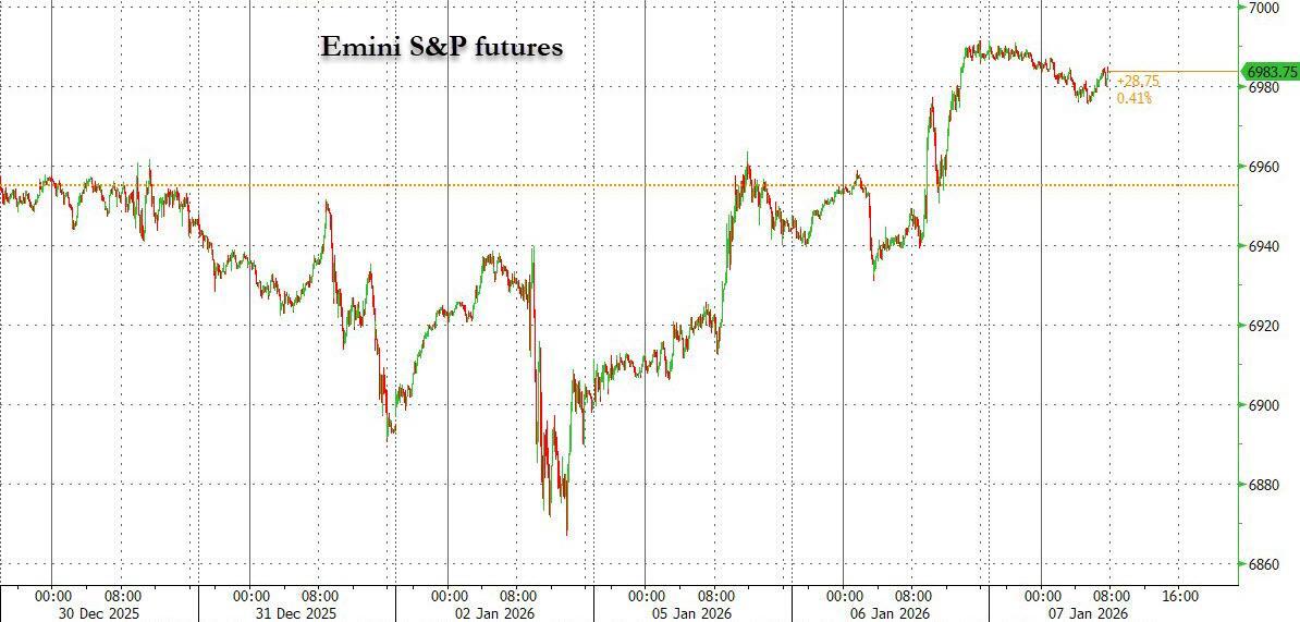 US equity futures are weaker but off session lows, as markets pause ahead of a series of US labor and economic data. As of 8:00am ET, S&P futures are down 0.1% as global equity markets have run into some resistance after a strong start to 2026; Nasdaq futures dip 0.2% with TMT underperforming premarket, with most Mag7 and Semis names lower while Energy, Healthcare and Staples rallying pre-mkt. Bonds are bid with yields down 2-4bp as the curve flattens; the USD is unchanged. n commodities, Ags are the bright spot as we see some profit-taking in Metals and oil fell after Trump said Venezuela would turn over as many as 50 million barrels of crude to the US with sales proceeds are expected to be split between the two countries. Today's US economic calendar includes December ADP employment change (8:15am), December ISM services index, November JOLTS job openings and October factors orders (10am). Scheduled Fed speakers include Bowman on banking supervision and regulation at 4:10pm