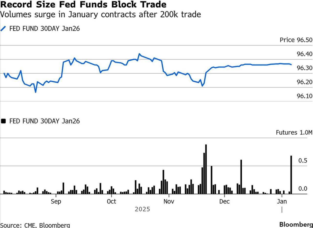 Ahead of a slate of data in the next few days, a record-sized block trade was placed in the federal funds futures market. The trade was struck in the January contracts for a size of 200,000, the largest ever as confirmed by CME Group. The motive behind the transaction is unclear. It could be related to an unwinding of existing bets or a wager that could benefit from a potential shift in market pricing for the Fed’s next rate decision.