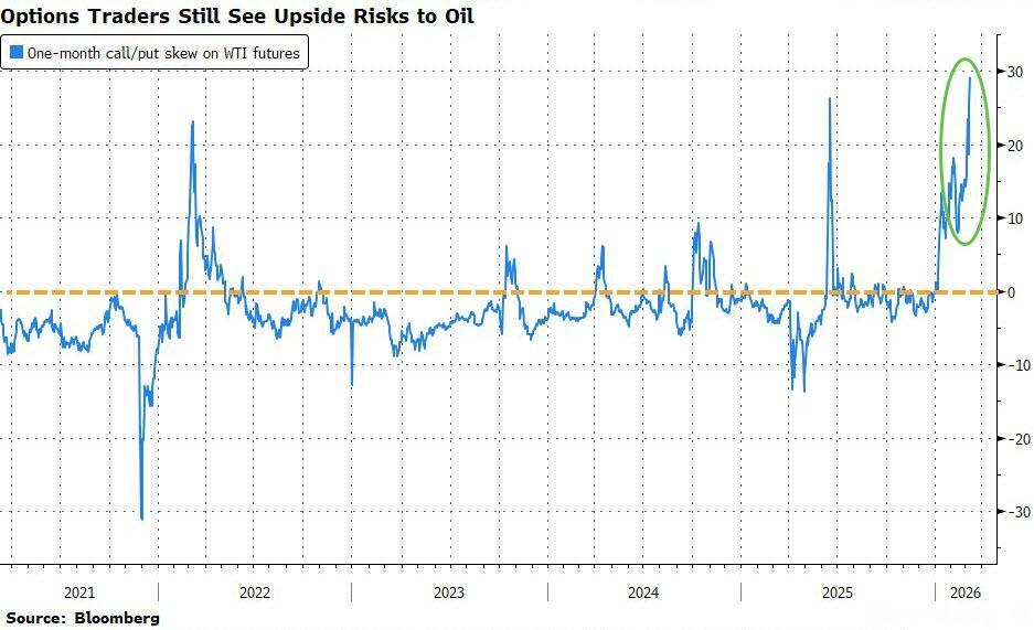 However, as Bloomberg's Ye Xie notes, despite the slump of crude oil prices and the calming of Brent crude spreads this morning, WTI option traders still see risks skewed toward higher prices. Investors are paying the highest premium in years for call options for WTI futures over puts...