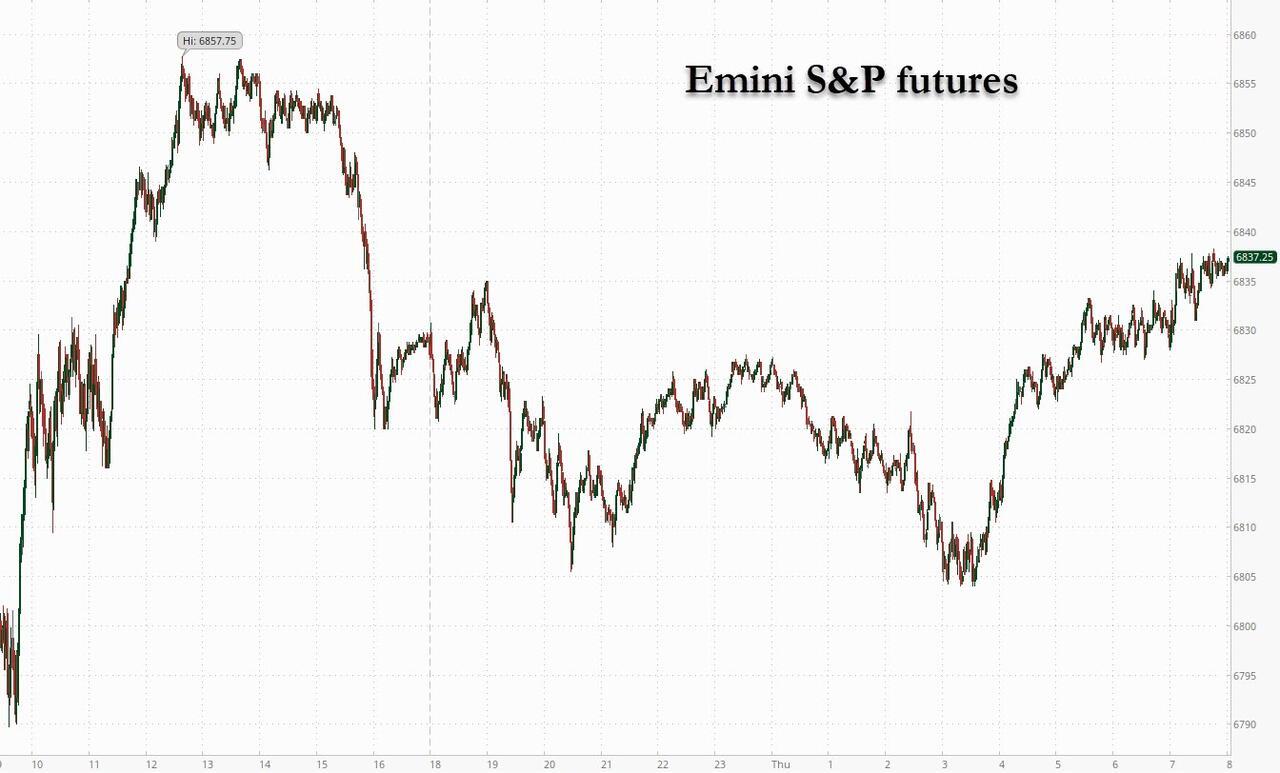 US equity futures are higher, rebounding from session lows for the second day in a row, amid headlines that layoffs are surging due to AI which in turn is raising odds of a Dec rate cut, with JPM saying that "the market is weighing a weaker labor market and potential spending vs. evidence on the efficacy (and ROI) of AI plus productivity gains." Challenger job cuts jumped to over 150K in October, nearly triple the year-earlier period and the most in more than two decades. As of 8:00am ET, S&P futures are 0.2% higher ahead of the last major earnings day of a season that’s delivered stellar results; Nasdaq futures are also up 0.2%, with Semis catching a bid driven by MRVL (+11%, takeover chatter) and NVDA (up +1.4% after yesterday’s roll on the OpenAI govt backstop headlines). TSLA rose 0.5% ahead of a vote on granting Elon Musk a potential $1 trillion pay package. In the premarket, cyclicals look flat to Defensives, while commodity-related plays are bid. The commodity complex is higher led by Energy and Metals. Asia closed higher (Shanghai +97bps/Hang Seng +2.12%/Nikkei +1.34%) driven by strength in growth/tech/ai names, while Europe is down small (FTSE -25bps/DAX -10bps/CAC -45bps). US 10 year yield down small at 4.13% on quiet macro news as the curve bull steepens, and the USD is weaker. The macro data focus is on Challenger Job Cuts which soared to 153,074K, the highest for October since 20023, and state-level initial jobless claims. Today also brings another heavy dose of earnings (pre-open we get APD, BDX, CMI, COP, H, PENN, PH, RL, ROK, TPR...post-close we get AKAM, CE, EXPE, MCHP, SNDK, TTWO, WYNN), a handful of Fed speakers, the BOE rate decision and TSLA’s annual meeting (which includes voting on Musk’s pay package). Markets also digest the likelihood of the Supreme Court striking down Trump’s IEEPA tariffs after oral arguments yesterday (Goldman expects a ruling in Dec of Jan ’26 // GIR full take).
