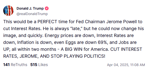 But wait, there's more... because with Fed Chair Jerome Powell set to speak momentarily, Trump reminds the Fed chair who really is boss when in a subsequent post on TS, the president said that "this would be a PERFECT time for Fed Chairman Jerome Powell to cut Interest Rates. He is always “late,” but he could now change his image, and quickly. Energy prices are down, Interest Rates are down, Inflation is down, even Eggs are down 69%, and Jobs are UP, all within two months - A BIG WIN for America. CUT INTEREST RATES, JEROME, AND STOP PLAYING POLITICS!"