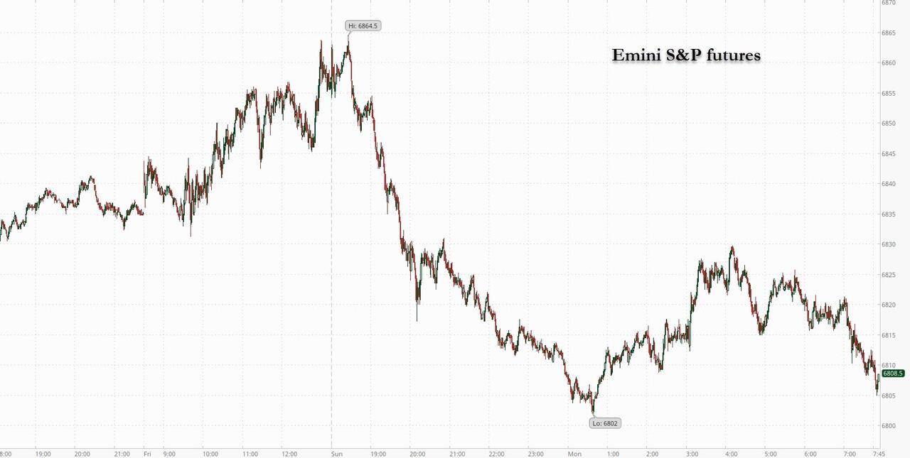 After a torrid meltup last week to end the month of November on a euphoria, if extremely illiquid note, futures are once again sinking as we start the final month of the year, in a swoon that was again catalyzed by a plunge in bitcoin which appears to have been spooked by hawkish overnight comments by the BOJ which continues to bluster that it may hike rates one day... soon... for real this time. As of 8:00am S&P futures were 0.7% lower while Nasdaq 100 contracts were -1.0%. Bond yields are 1-4bp higher. Bitcoin slid below $86,000, dragging the entire space and pulling crypto-linked stocks into the red. The Magnificent Seven also declined in premarket trading, with Tesla, Meta and Nvidia each falling more than 1%. Global bond yields are all higher this morning: Japan yields are 3-7bp higher led by the 7yr amid hawkish hint from the BoJ. OPEC+ countries agreed to maintain group-wide oil output quotas (i.e., pausing oil output hike) for 2026 yesterday, given the YTD decline in oil; Oil +1.7% since last Friday’s close. Trump said on Sunday that he has decided on his pick for the next Federal Reserve chair after making clear he expects his nominee to deliver interest-rate cuts. The US economic calendar includes November final S&P Global US manufacturing PMI (9:45am) and November ISM manufacturing (10am).