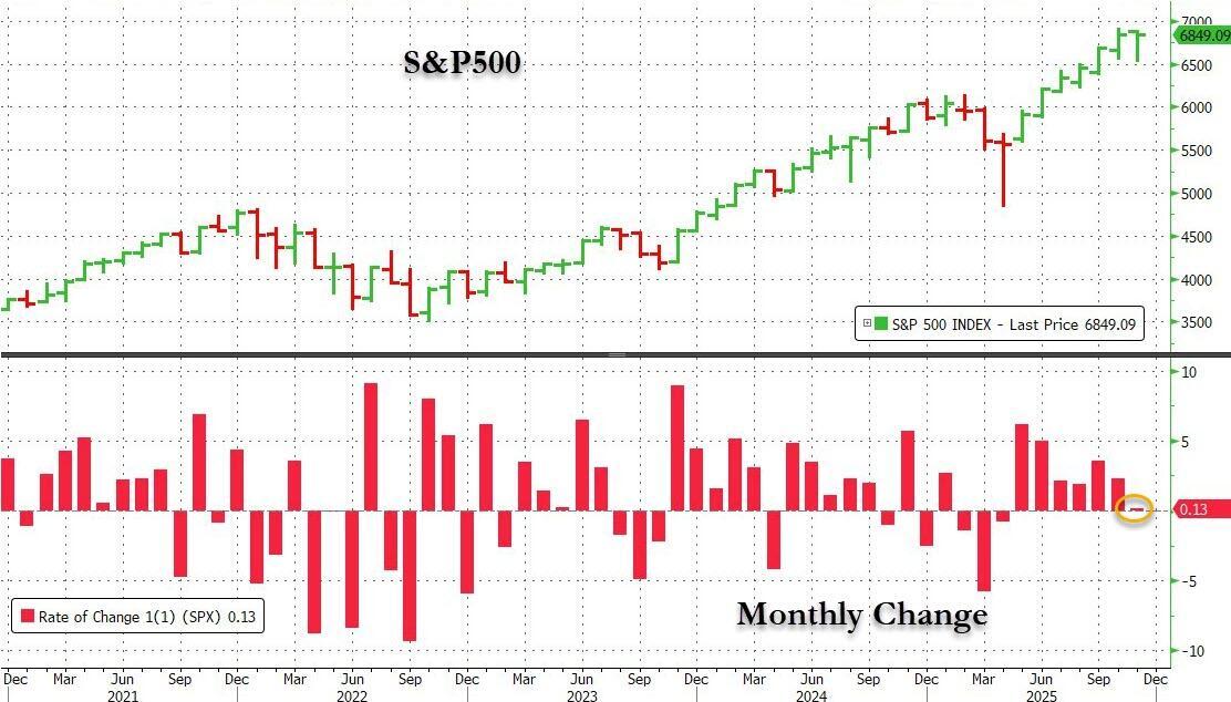 Thanks to a powerful ramp on Friday, November marked the seventh straight month of gains for the S&P 500, the longest streak since 2021 as the monthly closed just barely in the green, rising 0.17%. It wasn't enough for the Nasdaq 100 however, which was hampered by concerns about stretched AI valuations, and fell 1.6% in the month.