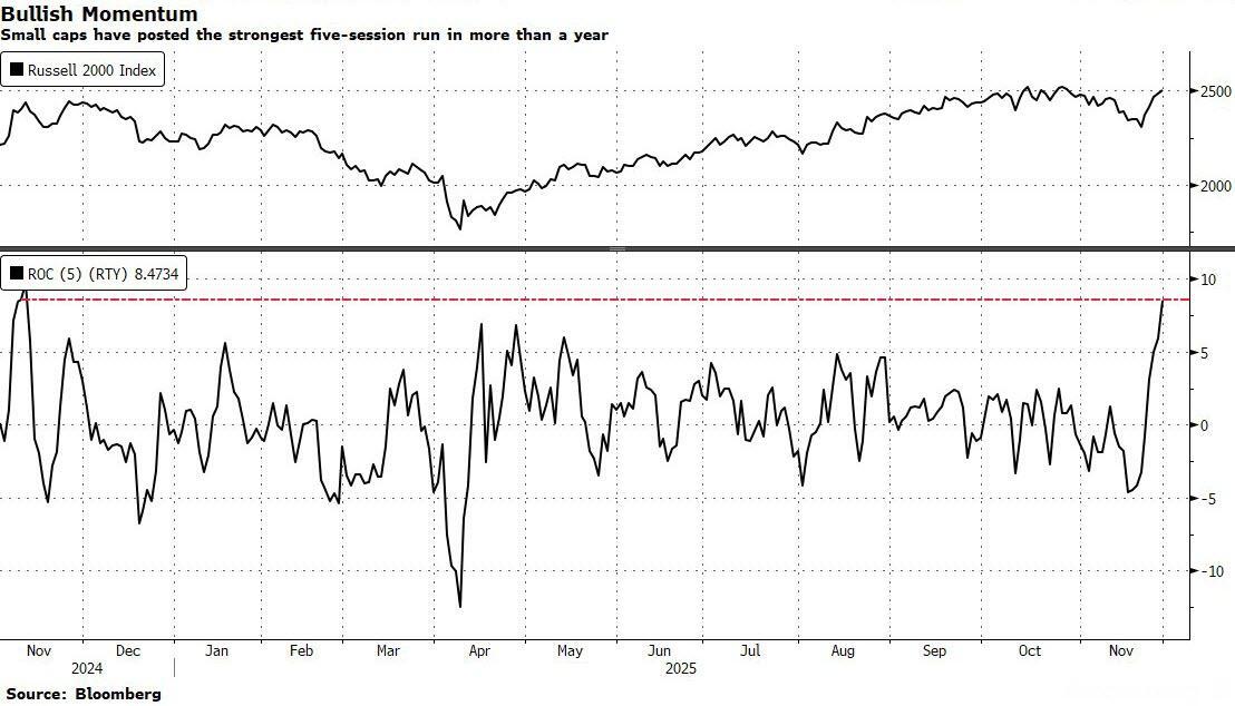 It's not all gloom: traders are placing bullish bets on small-cap stocks in anticipation of lower rates. The Russell 2000 Index jumped 8.5% in the five trading days through Friday, making up the bulk of its gains this year.