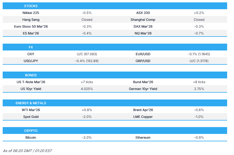 - 10yr UST futures gradually edged higher as yields continued to soften following the holiday closure on Monday for Washington's Birthday, while participants look ahead to data and Fed speak.