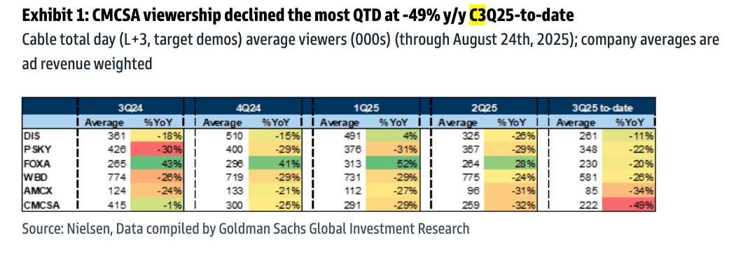 Through August 24, cable networks continued to lose viewers. In 3Q25 so far, total day ratings fell at Disney (-11%), Paramount Skydance (-22%), Fox (-20%), Warner Bros. Discovery (-26%), AMC Networks (-34%), and Comcast (-49%).